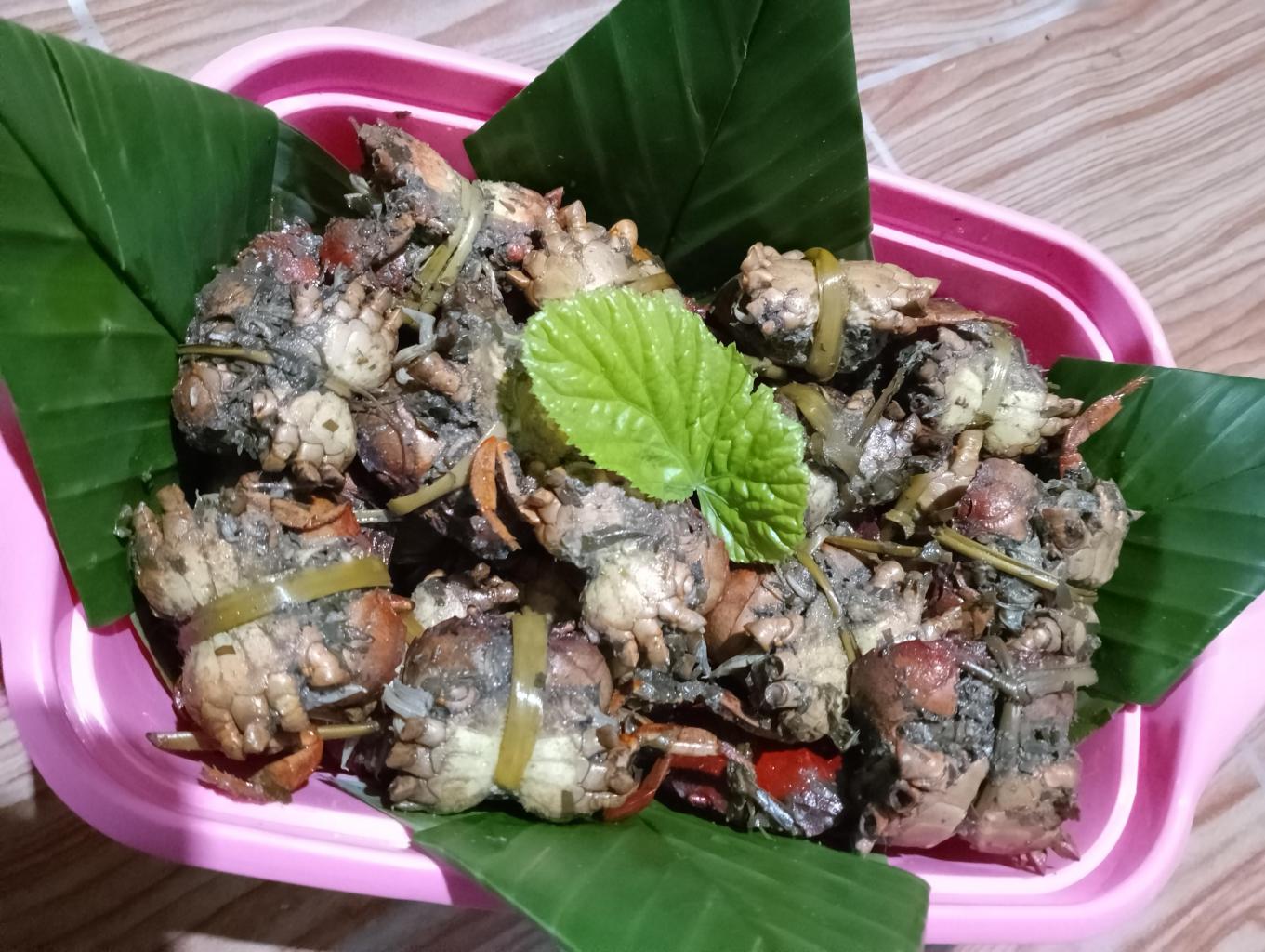 Masakan kepiting ini merupakan kuliner yang populer di kalangan masyarakat desa. Umumnya bahan-bahan yang dimasukkan kedalam cangkang kepiting adalah kelapa parut, daun ariang (daun yang memiliki rasa asam), bumbu-bumbu lainnya. Kepiting yang digunakan sendiri adalah kepiting sungai, ukurannya lebih kecil dan rasanya lebih gurih dari kepiting bakau.